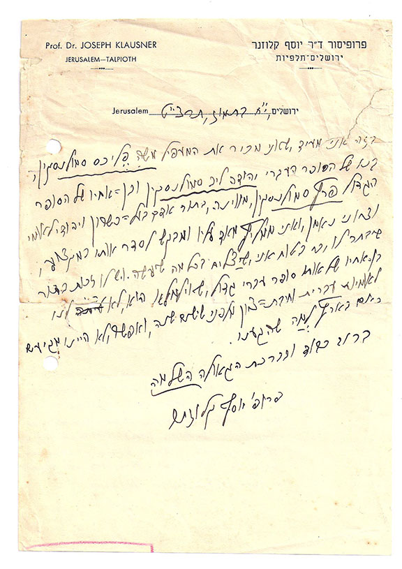 KLAUSNER, Dr. Joseph (1874-1958). Scholar, appointed professor of Modern Hebrew Literature at Hebrew University (1926). Published hundreds of scholarly works on Jewish History and literature. Editor of Ha-Shiloah from 1950 and was Editor in Chief of Encyclopedia Hebraica. In 1949, Klausner ran against Chaim Weizmann for President of Israel. Scarce autograph letter signed on his name imprinted stationery. Jerusalem. Written and signed in Hebrew, not translated. Some light wrinkling, usual file holes and one tear repaired. Anything signed by Klausner can be considered scarce..................................$165.00