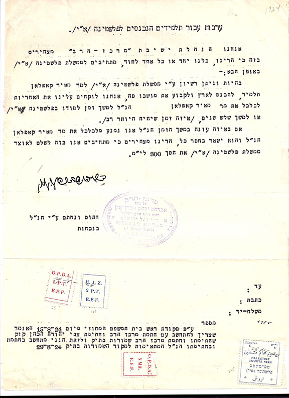 KOOK, Abraham Isaac Hacohen (1865-1935). Religious thinker, the famous Chief rabbi of Palestine from 1919. Author, one of his articles became the ideological basis for the Mizrahi movement. Typed document signed as Chief Rabbi, Jerusalem, 1924. Legal document regarding the collection of some monies owed. Kook’s Official rubber stamp has been affixed to the lower center portion and below his CHOICE signature. Four stamps have been affixed to the lower portion of this legal document, one being a Palestine Court Fees stamp. Most unusual...........................SOLD