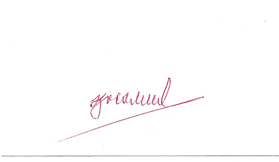 KOSOLAMOV, Filip (1919- ?) Russian fighter pilot WWII. Credited with 12 +6 victories. Hero of the USSR. Winner of numerous medals. Choice signature in a bold red ink on a 3”x5” card.......$85.00