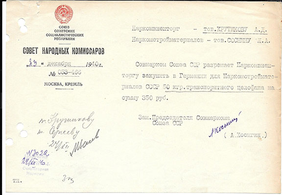 KOSYGIN, Alexei (1904-1980). Soviet-Russian statesman during the Cold War. He was the youngest Mayor of Leningrad. He was the Premier of the Russian Federation (1943-1946), First Deputy Chairman (1960-1964) and First Deputy Premier (1964-1980). Official Russian Document, not translated, dated 1940. Early typed document signed in ink. File holes in the left margin otherwise fine condition..................$395.00