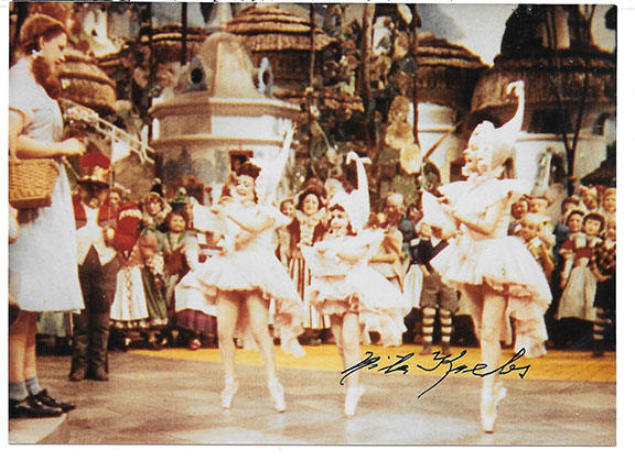 KREBS, Nita (1905-1991). Actress played a Munchkin Lullabye League Girl in the Wizard of Oz. Color photograph, 3”x5” of Judy Garland looking over the three Lullabye Girls. Signed, in ink, by Nita Krebs. In very fine condition..............SOLD |