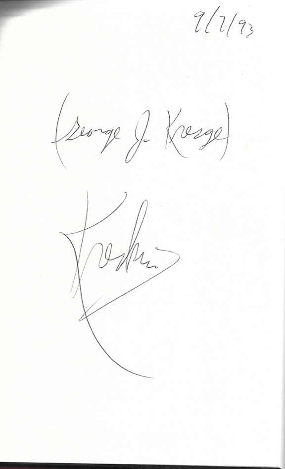 KRESGE, JR., George Joseph (1935-2024). An American mentalist also known as the Amazing Kreskin. From 1972-1975 his TV series “The Amazing World of Kreskin” was very popular. He appeared on 100’s of TV appearances and on the most popular late night shows. A book from his library: The Rush Limbaugh Story, Talent on Loan from God by Paul D. Colford. St. Martin’s Press Sept. 1993, First Edition, First Printing. Hardcover 242 pages. Double signed on the first free endpaper: “ George J. Kresge, 9/7/93, Kreskin.” In Mint condition with dust jacket.............$45.00