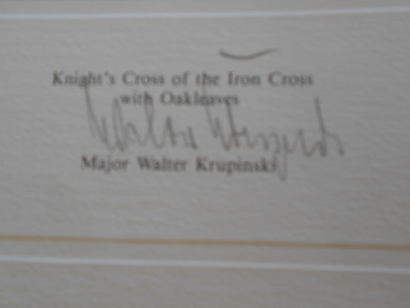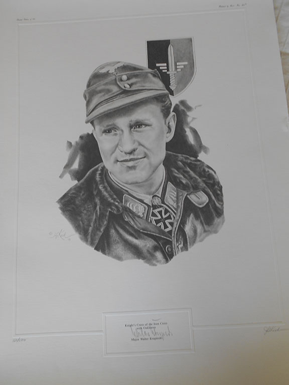 General Walter Krupinski, Signed, Limited Edition print Co-signed by the artist J.G. Krek Wonderful lithograph by artist J.G. Keck, published by the King’s Crown Gallery in 1989. Limited to 500 numbered and signed copies by both J.G. Keck and Walter Krupinski. Measures appx: 19”x25”. After the printing of these lithographs, the printing plates were destroyed. As new condition. Walter Krupinski (1920-2000) was a German General and Luftwaffe Fighter Ace. He is credited with 197 victories in 1,100 sorties. Bailed out four times and was wounded five times. He was one of the first to fly the Messerschmitt ME262 jet fighter in combat. In very fine condition. This print is copy number 52 of 500 copies................$125.00 ![]() ![]() |