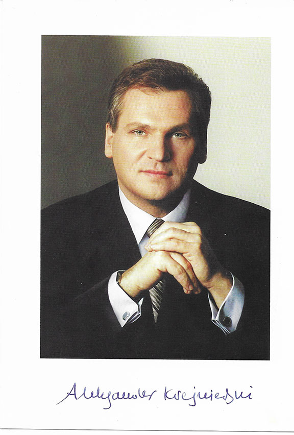 KWASNIEWSKI, Aleksander (1954- ) Polish politician, President of Poland 1995-2005. Defeated Lech Waleska and re-elected to a second term. Fine color photograph, head and shoulders pose. Overall, 6”x8” and boldly signed with a full signature on the lower white margin......................$30.00![]() |