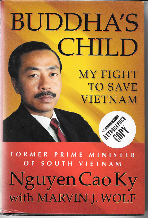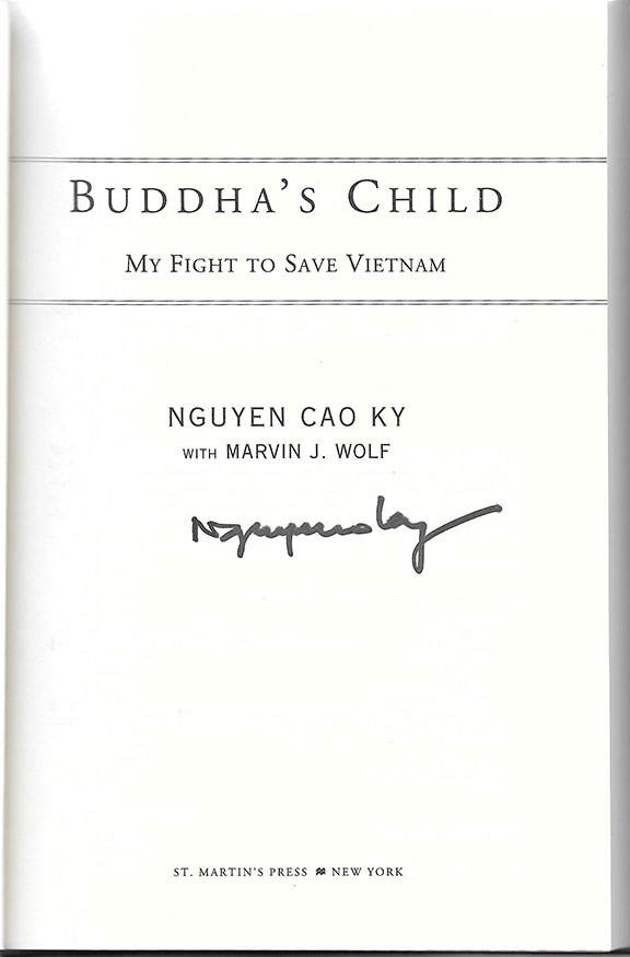 Ky, Nguyen Cao (1930-2011). War time Prime Minister of South Vietnam (1965-67). Chief of the Vietnam Air Force. His book "Buddha's Child, My Fight to Save Vietnam." St. Martin's Press, 2002, First Edition, so stated. Three hundred seventy-six pages with illustrations. Signed on the title page. In fine + condition with the dust jacket. A scarce signed book...............SOLD