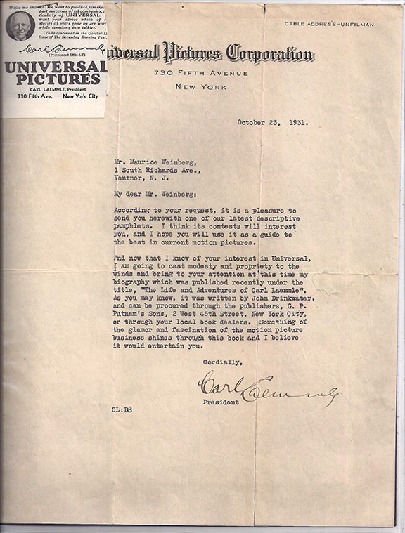 LAEMMLE, Carl (1867-1939). Motion Picture executive, Jewish emigrant from Germany. He created the Independent Motion Picture Co. of America in 1909. He merged Independent Motion Picture Co. with other small companies and found Universal Film Manufacturing Co. in 1912. Universal City opened in 1915. He organized and headed Universal Pictures Corp until 1936 when he sold his holdings. He produced the first full length photoplay in 1912 and produced the first million dollar picture Foolish Wives (1922). Typed letter signed, on the imprinted stationery of Universal Pictures Corp., Carl Laemmle, president. Oct.23, 1931, New York. To Mr. Maurice Weinberg. In this letter he encloses a descriptive pamphlet (not enclosed) and wants it used as a guide to the best in current motion pictures. He then goes on to promote a biography written about him by John Drinkwater. He states: “...something of the glamour and fascination of the motion picture business shines through this book and I believe it would entertain you...” A few separations in the folds (repaired on the verso) and one irregular tear not touching the type and also repaired. Small biography of Laemmle stapled to top left corner easily removable is so desired. Quite an attractive letter and quite an uncommon signature in any form............... $595.00