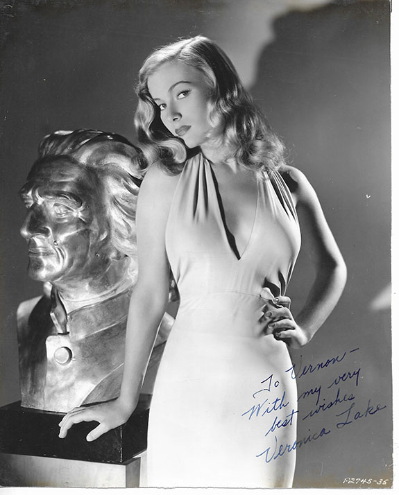 LAKE, Veronica (1922-1973). American film, stage, and TV actress. Known for her Pee-A-Boo hair style. Very scarce vintage photograph,7.5”x9”, of this beautiful actress, three quarters pose with her trademark Peek-A-Boo hairstyle, a very seductive look. Inscribed and signed: “To Vernon-With my very best wishes Veronica Lake.” A 25-line biography typed biography on verso with minor mounting traces at the corners. In fine condition.....................$1100.00![]() |
