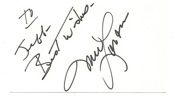 LANDON, Michael (1936-1991). American actor, writer, director and producer. He starred in Bonanza, Little House on the Prairie and Highway to Heaven. Choice, inscription, sentiment and signature on a 3”x5” card. Not common in genuine autographs...........SOLD |