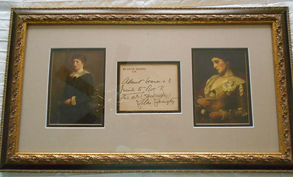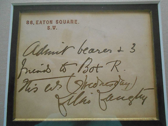 LANGTRY, Lillie (1852-1929). Popular British-American socialite, a young woman of grace and charm, actress known as The Jersey Lily appeared in many plays in London and America. She was the mistress with The Prince of Wales (Edward VII) who introduce Langtry to his mother Queen Victoria who accepted Lillie. She also had relationships with the Earl of Shrewsbury and Prince Louis of Battenberg. Her fame in the theatre led her to become the world’s first woman millionaire and the most photographed woman in the world. Slip: “86, Eaton Square, S.W. where Langtry has written: “Admit bearer and 3 friends to Box R this Wednesday, Lillie Langtry.”. Double matted with two color portraits of Langtry. In an elegant frame. Overall measurement is 14”x24”. Quite attractive.........$550.00