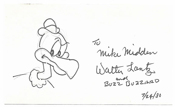 LANTZ, Walter (1899-1994) American cartoonist, actor. Creator of Woody Woodpecker. On a 3”X5” card Lantz has drawn one of his popular characters and inscribed, signed and dated it: “To Mike Midden Walter Lantz and Buzz Buzzard 7/24/80.” In excellent condition with original envelope.....................$75.00![]() |