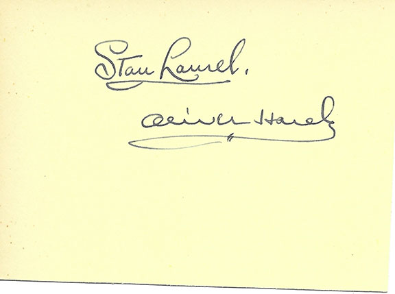 The greatest comedy duo in the history of cinema. The thin English-born Laurel began acting with a British touring company before traveling to America in 1910. He started his film career in the silents from 1917. His future partner, the fat Hardy joined a troupe of minstrels before casually contrasting personalities, general clumsiness made them the most loved comedians of their time, a popularity that remains today. A fantastic pair of signatures together on a single album page. Very scarce as such. This is one of the finest pair of signatures of Laurel and Hardy we have seen in over 40 years. Together with an ”8x10” B&W photograph of the duo in an old car. A fabulous pair for framing......................$950.00