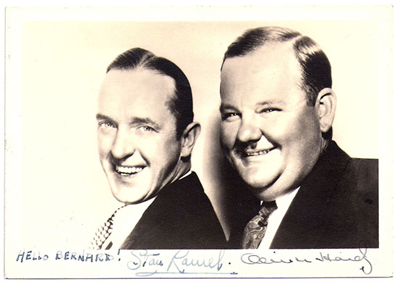 Laurel, Stan (1890-1965) and HARDY, Oliver (1892-1957). America’s greatest comedy team. This fat and skinny duo brought laughter to generations of filmgoers. Photograph. 5”x7”, B&W, of the young team shortly after teaming up and possibly before they invented their characters. Inscribed and signed by Laurel. Signed by Oliver Hardy. A fine example of an uncommon photograph................ $1500.00 |