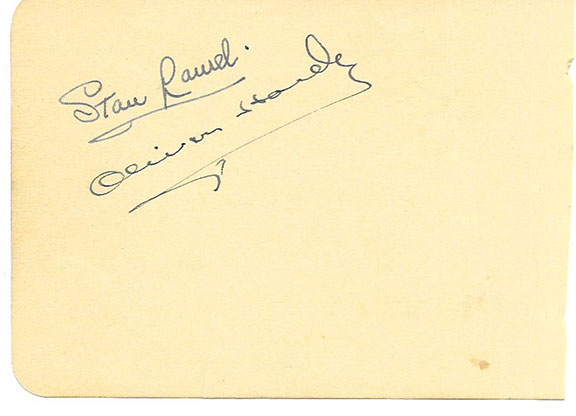 The greatest comedy duo in the history of cinema. The thin English-born Laurel began acting with a British touring company before traveling to America in 1910. He started his film career in the silents from 1917. His future partner, the fat Hardy joined a troupe of minstrels before casually contrasting personalities, general clumsiness made them the most loved comedians of their time, a popularity that remains today. A fantastic pair of signatures together on a single album page. Very scarce as such. This is one of the finest pair of signatures of Laurel and Hardy we have seen in over 40 years. On the verso is a pencil signature of David E. Rose (1895-1992). He was a producer of many films from 1930 on. He was the financial advisor and general manager to silent screen star Douglas Fairbanks, Sr. Rose served as Vice-President of United Artists and general manager of Samuel Goldwyn Productions. Rose headed the British department of Paramount Pictures until 1949. He formed the David E. Rose Productions. Perfect for matting with your favorite photograph of the two...............$950.00