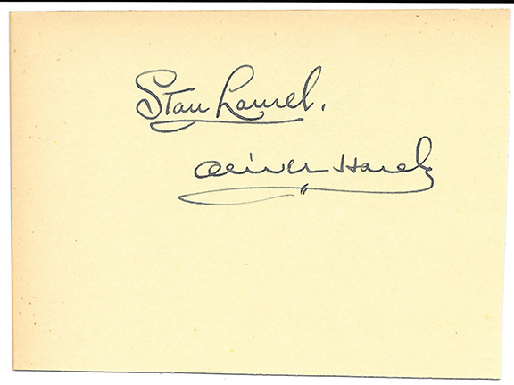 The greatest comedy duo in the history of cinema. The thin English-born Laurel began acting with a British touring company before traveling to America in 1910. He started his film career in the silents from 1917. His future partner, the fat Hardy joined a troupe of minstrels before casually entering the film business. In 1926 the two came together and made many full length films. Their contrasting personalities, general clumsiness made them the most loved comedians of their time, a popularity that remains today. A fantastic pair of signatures together on a single album page. Very scarce as such. This is the finest pair of signatures of Laurel and hardy we have seen in over 40 years. Perfect for matting with your favorite photograph of the two................SOLD
