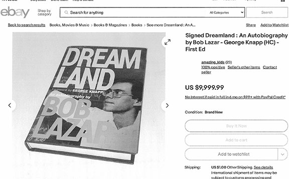 LAZAR, Bob Physicist who was employed and working at Area 51. He was tasked with understanding an exotic propulsion system being used by an advanced aerospace vehicle he was told came from outer space. He blew the whistle and revealed to the world the secrets he knew about America’s outer space program This is his story about the experiments being conducted at Area 51. His book DREAMLAND An Autobiography. Interstellar Books, 2019. First Edition, 243 pages, hard cover. Signed on the first flyleaf “Flying Saucers & Aliens Are Real! Bob Lazar.” In Mint condition with dust jacket. We have only been able to find one signed copy on eBay for a whopping $9,999.99 located in South Africa. Our price .........$750.00