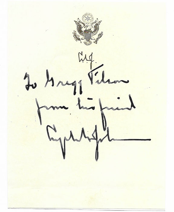 JOHNSON, Lyndon B. (1908-1973). 36th President of the United States. His personal bookplate made specifically for his book “The Vantage Point” (1971). Gilt embossed Presidential Seal along with his initials. Boldly signed in full by Lyndon B. Johnson. Most seasoned autograph dealers will tell you that genuine signatures of Lyndon B. Johnson are very difficult to obtain. He used the Autopen machine and secretaries. Many documents are signed with a printed signature. Many books are signed and or inscribed by his secretary. Basically, the only way to ensure you have an absolutely genuine signature of Johnson is to obtain one of these bookplates His personal bookplate, inscribed and signed with a very bold signature of Lyndon B. Johnson. As nice an example as can be especially for those who prefer to have additional handwriting by the president.............$295.00