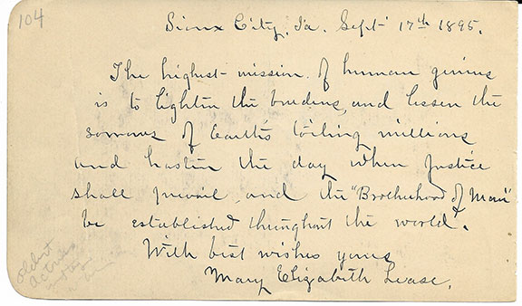 Lease, Mary Elizabeth (1853-1933). Author, orator, advocate of the suffrage and temperance movements. Wrote “Problems of Civilizations Solved” (1896). Editor of the World newspaper and editor of National Encyclopedia of American Biography. Her supporters called her “Queen Mary” and “Mother Lease”. Her detractors called her “Mary Yellin”. She was a powerful orator an some of her enemies called her “petti-coated smut-mill” because of her venomous tongue. Very scarce to rare autograph quotation signed on an album page: “Sioux City, Ia. Sept.17th 1895. The highest mission of human genius is to lighten the burdens and lesser the sorrows of Earth’s toiling millions and hasten the day when Justice shall prevail and the ‘Brotherhood of Man’ be established throughout the world. With best wishes yours Mary Elizabeth Lease”. One slit affecting three words on left side of page otherwise a very good example......................................$185.00