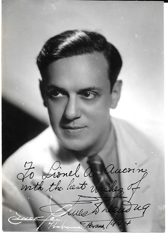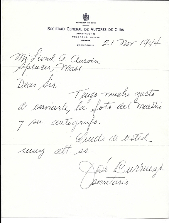 Photograph, B&W, head & shoulders pose, measuring 4.5’x6.5”. Inscribed, signed and dated “Havana 1944” by Ernesto Lecuona. Together with a handwritten letter from the Secretary of the Sociedad General De Autores De Cuba presenting the photograph. The original envelope with two attractive cancelled 3 cent Cuban stamps is included. The envelope contains a tape across it stating the package was opened and examined. All in fine condition