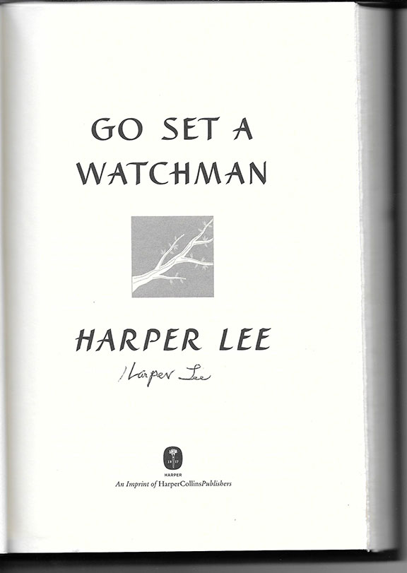LEE, Harper (1926-2016). American novelist. her book To Kill A Mockingbird became a classic and was adopted into a major motion picture starring Gregory Peck. Her second book Go Set A Watchman was published a year before her passing. Harper Collins Publishing Co. 2015, First Edition so stated. Two hundred seventy-nine pages. Signed by harper lee on the title page. Another dealer and ourselves were to meet Harper Lee in her nursing home in Monroeville, Al. She did agree to this and even made a special request, however her health turned for the worse and this book was mailed to her. She signed it less than a month before her passing. In V/G condition................$695.00