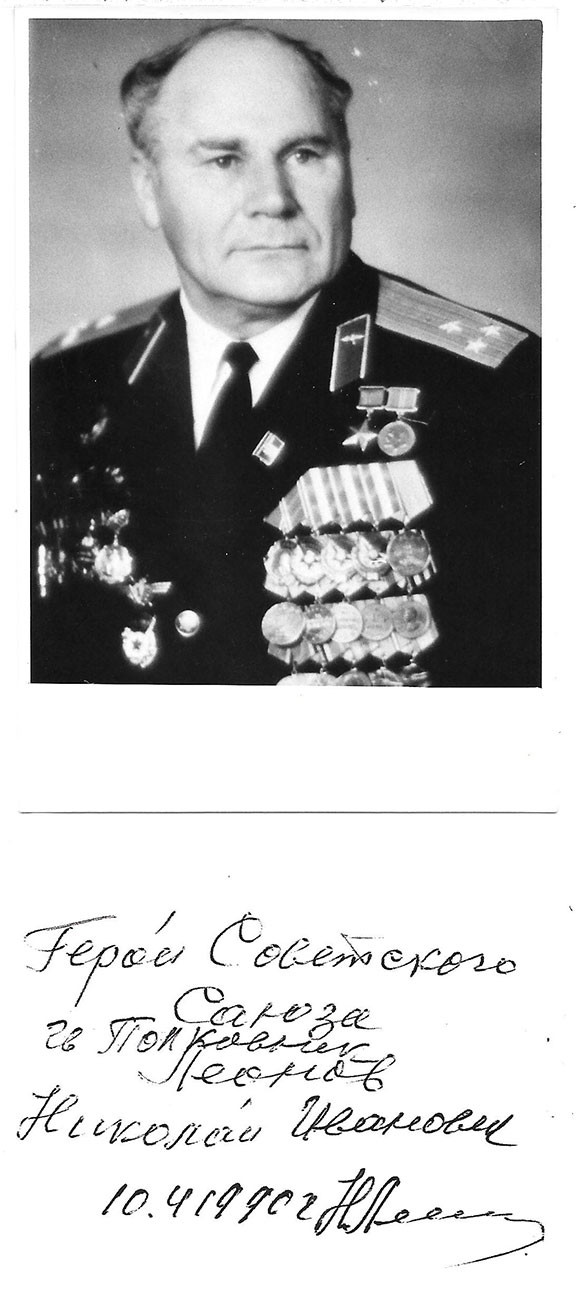 LENOV, Nikolai. Fighter pilot, U.S.S.R. Ace with 27 victories. Hero of the U.S.S.R. Recipient of the Lenin order and 2X Order of the Red Star. Photograph, B&W, 3.5X5” half length pose in uniform with a chest full of medals. On the verso is a 5 line inscription signed and dated. In fine condition................$150.00![]() |