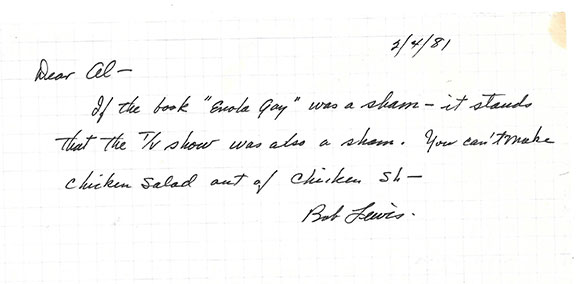 LEWIS, Bob (1917-1983). Co-Pilot of the Enola Gay. Died at the early age of 65. Very scarce autograph letter signed, one page to “Dear Al” dated Feb. 4, 1981. Lewis writes: “If the book ‘Enola Gay’ was a sham - it stands that the T/V show was also a sham. You can’t make chicken salad out of chicken sh--- Bob Lewis.”...........................................SOLD
