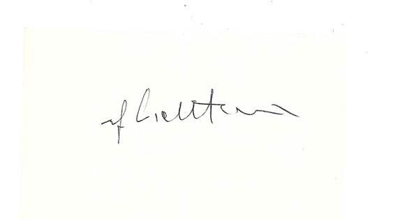 LICHTENSTEIN, Roy (1923-1997). American Pop Artist who found fame worldwide. His painting “Torpedo” sold at Christies for a world record 5.5 million dollars. A very uncommon signature well centered on a 3”x5” card. A wonderful example to frame along with your favorite Lichtenstein print................$95.00 |