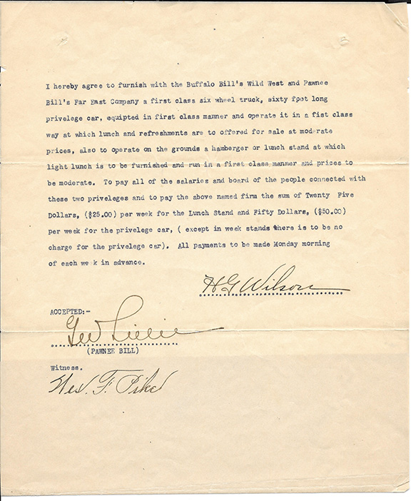 LILLIE, Gordon W. (Pawnee Bill). (1860-1942). Legendary frontiersman, interpreter for the Pawnee Indians, contemporary of Buffalo Bill, Wild Bill Hickok and Bat Masterson. Originated the “Oklahoma Boomers” and led them in the land rush of 1889. Circus owner, founded the “Historic Wild West” tent show (1890). Partner of Buffalo Bill Cody (1908-1913). Known as the “White Chief of the Pawnees”. Original, one page circus contract between Buffalo Bill’s Wild West and Pawnee Bill’s Far East Co. Agreement that H.G. Wilson, showman and manager of side and pit shows for Buffalo Bill & Pawnee Bill during the season of 1911. Wilson will furnish a 1st class 6 wheel truck equipped in a first class manner for lunch and refreshments offered for sale at moderate prices. This contract also gives permission to operate a hamburger or lunch stand. Agreement to pay salaries and above company for these privileges. Signed by showman H.G. Wilson, G.W. Lillie and Wes F. Price as their witness. A very scarce circus item and in very good condition.................$950.00