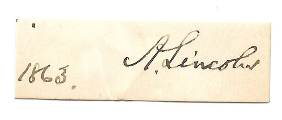 LINCOLN, A. (1809-1865). Sixteenth President of the United States. Choice dark and bold signature adding; “1863” in his hand. A wonderful example...........SOLD