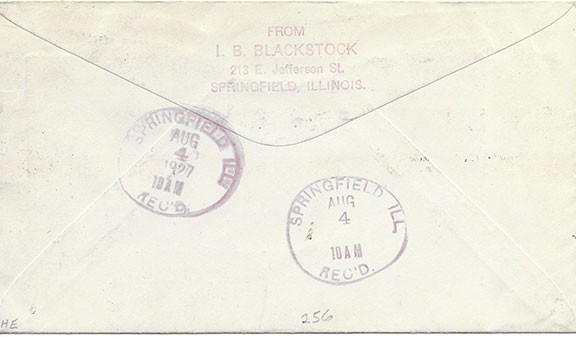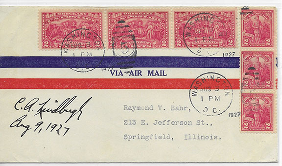 LINDBERGH, Charles A. (1902-1974). American aviator, military officer, author, and inventor. On May 20-21, 1927 he flew the first solo nonstop flight from New York to Paris. He received the Medal of Honor from President Calvin Coolidge. In 1938 Hermann Goring presented Lindbergh a medal on behalf of Adolf Hitler. Later, Lindbergh refused to return the medal. Lindbergh witnessed the launch of Apollo II. While married he had seven children with two German ladies and his private secretary. Scarce Air Mail cover, affixed are 6 U.S. postage stamps cancelled Washington, D.C. Aug 3,1927. On the verso are two cancellations Springfield, ILL Aug 4 1927 Rec’d. On the front, bottom left corner is signed “C.A. Lindbergh Aug 9,1927.” Lindbergh is flying the air mail just 53 days after returning home from Paris. Fine condition.....................$1500.00