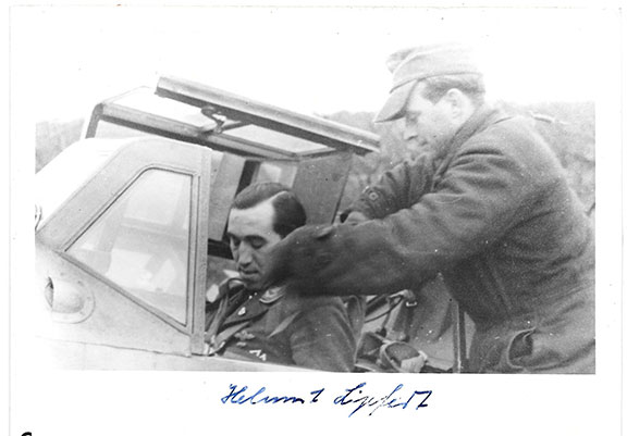 LIPFERT, Helmut (1916-1990). German fighter pilot in the Luftwaffe during WWII. Thirteenth highest scoring Ace. Credited with 203 victories. Uncommon photograph, 5”x7", B&W of Lipfert sitting in the cockpit of his plane and being helped by another. Signed, in full, along the lower white margin. Helmut Lipfert is not common in signed photographs............SOLD