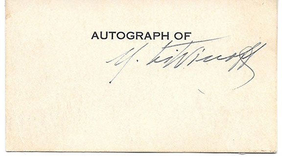 LITVINOV, Maksim M. (1876-1951). Russian Communist leader, most colorful and controversial of the major European diplomats of the 1930’s. He joined the Russian Social Democratic Labor Party (1898). He was imprisoned, escaped Russia in 1902 and settled in France. In 1903 he joined the Bolsheviks under Lenin and was deported from France for smuggling arms into Russia. Stalin dismissed Litvinov in May 1939 believing that as a Jew he would be unable to reach an agreement with Nazi Germany. From Dec.41 to July 43 he was the Soviet Ambassador in Washington. Uncommon autograph, in ink on a card created for collecting autographsh....................SOLD