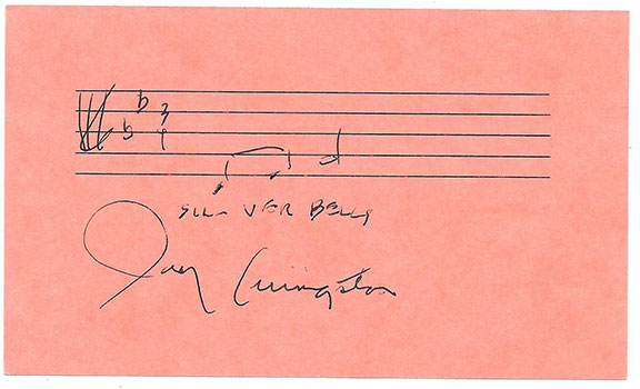 LIVINGSTON, Jay (1915-2001). American composer and singer. Noted for his songs composed for films. Known for “Buttons & Bows”, “Mona Lisa”, “Que Sera, Sera”. His Christmas song “Silver Bells” was written for the film “The Lemon Drop Kid”. Autograph musical quotation signed on an orange 3”x5” card. The composer penned the first few notes of music and wrote the lyrics from his much loved song “Silver Bells”. Signed in full, directly below. A great holiday gift.............$95.00 |