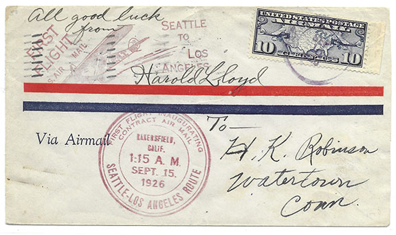 LLOYD, Harold (1893-1971). American film actor, best known for his silent movie comedies. First Flight Air Mail cover, Seattle to Los Angeles, Stamped Seattle-Los Angeles Route, Sept. 15, 1926. Affixed is a US Air Mail 10 cent postage stamp cancelled on the verso San Francisco SEP 15, 1926. Hand signed with a four-word sentiment: “All good luck from Harold Lloyd.” Addressed in another hand “To- H.K. Robinson, Watertown, Conn.” In very good condition................$235.00 |