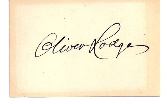 LODGE, Oliver (1851-1940). English physicist, he published his belief of the possibility of communication between the living and the dead. Investigated lightning, electro-magnetic waves, wireless telegraphy. Author of many books including Raymond which contained an account of his supposed communication with his dead son Raymond. Fine bold signature well centered on a card.............. $100.00
