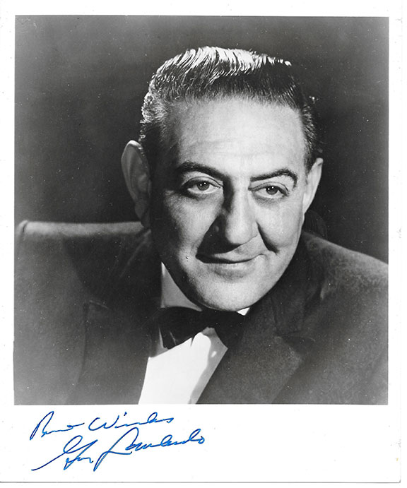 LOMBARDO, Guy (1902-1977). Canadian bandleader. He brought his band to the U.S. Midwest in 1924. Their name was the Royal Canadians. This band found a home in New York at the Roosevelt Hotel. Their broadcast appearances at the Waldorf-Astoria Hotel on New year’s Eve became a national tradition for nearly 50 years. Photograph, 8”x10”, B&W, bust pose, a smiling full face pose. Boldly signed with a two word sentiment on the lower white margin. Except for some light tape stains in the upper corner, in fine condition..............$75.00