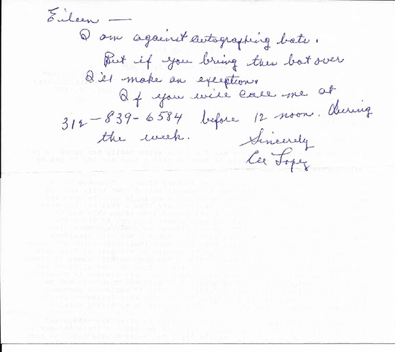 LOPEZ, Al (1908-2005) American professional baseball player. He was a catcher and manager who was inducted into the Baseball Hall of Fame in 1977. Uncommon autograph letter signed on the back of a collector’s letter to him. Circa Oct. 1991. Lopez writes: “Eileen - I am against autographing bats. But if you bring this bat over I’ll make an exception. If you will call me at 312-839-6584 before 12 noon during the week. Sincerely, Al Lopez.” In fine condition ..............$150.00 |