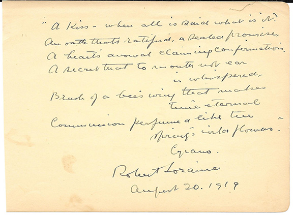 LORAINE, Robert (1876-1935). Aviation pioneer, daredevil, WW1 Ace. He achieved great fame in September 1910 when he made the first aeroplane flight from England to Ireland.. The same month he piloted one of the two Bristol Boxkites which took part in British Army manouevres on Salisbury Plain, during which he sent the first radio signals to be sent from an aeroplane in Britain. He is sited by the Oxford English Dictionary as the first written example of the word “joystick” to describe aircraft stick controls. Shot on more than one occasion, his wounds were x-rayed by Marie Curie. By the end of the war he reached the rank of lieutenant-general. His awards include the Military Cross and the Distinguished Service-Order. He is one of Britain’s best loved pilots. He was also a successful London and Broadway stage actor particularly associated with the works of George Bernard Shaw. He also won critical acclaim for performances in plays by William Shakespeare and August Strindberg. A handwritten poem quoting from “Cyrano” about a kiss. Nine lines written by Robert Loraine and dated by him August 20, 1919 on a large album page measuring 6”x7”. This is the first item signed by Robert Loraine to cross our desk in almost fifty years. We were able to confirm his signature by comparing it to his pilot’s license signature available on the Internet. In excellent condition..............................$450.00