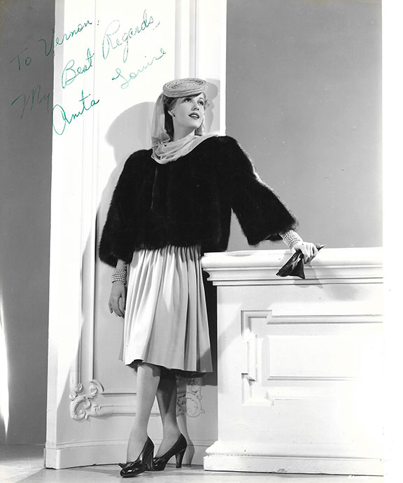 LOUISE, Anita (1915-1970). American film and television actress. This glamorous actress entered the film industry at the age of seven. She is known as one of cinemas stylish women. She appeared in over 70 films. Photograph, B&W, 7.5”x9” Stunning full length pose, inscribed and signed in green ink: “To Vernon, My Best Regards, Anita Louise.” In VG/Fine condition...........$95.00 |