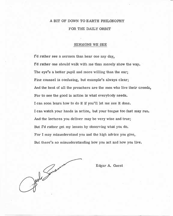 LOUSMA. Jack (1936- ) NASA Astronaut, member of the 2nd crew on the Skylab space station in 1973. He commanded the STS-3, the third space shuttle mission. Typescript, one page, of Edgar A. Guest, “A Bit of Down to Earth Philosophy for the Daily Orbit, Sermons We See”. One page, boldly signed at the conclusion by Jack Lousma. In fine condition ..............$57.50![]() |