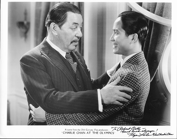 LUKE, Keye (1904- 1991) Luke had played Lee Chan opposite Warner Oland, his #1 son, in 1935 (Charlie Chan in Paris, Charlie Chan in Shanghai), 1936 (Charlie Chan at the Circus, Charlie Chan at the Race Track, Charlie Chan at the Opera), 1937 (Charlie Chan at the Olympics, Charlie Chan on Broadway, Charlie Chan at Monte Carlo) and opposite Peter Lorre in the 1938 film, Mr. Moto's Gamble. He was also known for playing Kato in two Green Hornet films, The Green Hornet (1940) and The Green Hornet Strikes Again (1941), and for his role as Dr. Lee Wong How in several films in the Dr. Gillespie series (1942, 1943, 1944, 1945 and 1947). Luke also had a large role in The Good Earth (1937) and was known to television viewers as Master Po on the TV series, Kung Fu (1972-1975) and the 1986 made-for-TV film, Kung Fu: The Movie. Luke, who also appeared regularly on M*A*S*H and other TV series, also lent his talents, and voice work for a long list of TV shows. Beautiful black and white photo of Charlie Chan at The Olympics, 8”x10” of Chan and Luke in an embrace, half length pose. Inscribed on the bottom white portion “To Robert Orth (President of American Film Archives) Good Luck always! Keye Luke #1 Son Charlie Chan.” Not common in signed photographs..................$175.00