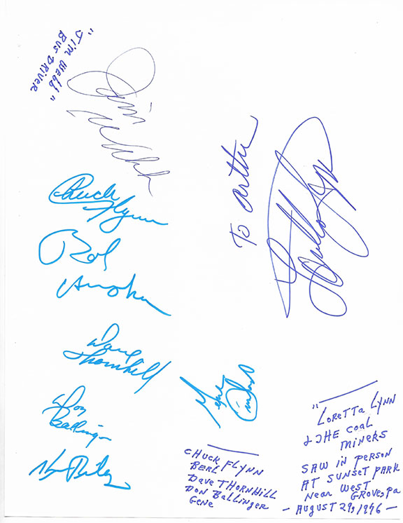 LYNN, Loretta (1932-2022) and The Coal Miners and the Bus driver. Sheet of paper 8”x10.5.” WRITTEN BY THE COLLECTOR BOTTOM RIGHT: “Lorett Lynn & the Coal Miners, saw in person at Sunset Park near West Grove, Pa. August 29, 1976. Inscribed with a huge signature: “To Arthur Loretta Lynn.” Using a bold Sharpie pen, the six Coal Miners all signed with the same pen. Jim Webb also signed this page adding “Jim Webb” Bus driver. Quite unique, a country music treasure. Certainly, worthy of placement in a serious county music collection. In very fine condition.........$150.00