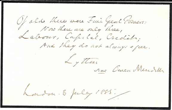 LYTTON, Edward Bulwer. (1831-1891). 1st Earl of Lytton, novelist, poet. Some of his novels were made into operas. His novel “A Strange Story” (1862) influenced Bram Stoker’s Dracula. He was Secretary of State For The Colonies (1858-59). He coined the phrases: “pursuit of the almighty dollar”, “The pen is mightier than the sword”, “it was a dark and stormy night” and more. Pseudonym “Owen Meredith.” A.Q.S., one page, London, 3 July 1885, on a black bordered card. “Of old there were 5 Great Powers, Now there are only three, Labour, Capitol, Credit; And they do not always agree. Lytton , Owen Meredith,” Very scarce in signed quotations... $450.00