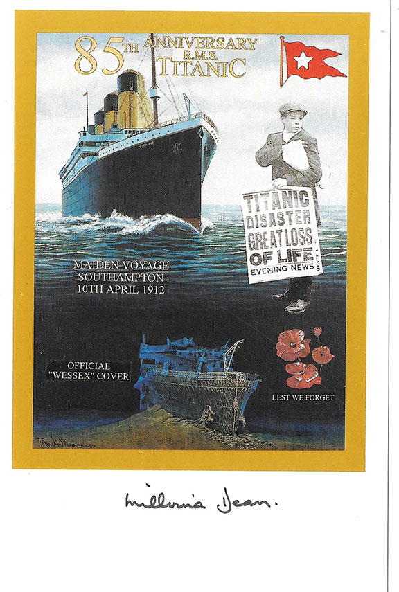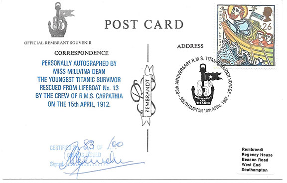 DEAN, Millvina (1912-2009). Some believe to be the youngest survivor of the Titanic disaster. Rescued from Lifeboat #13 by the crew of the Carpathia. For years she refused to autograph Titanic souvenirs. Choice limited edition postcard commemorating the 85th Anniversary of the RMS Titanic. Boldly signed on the lower portion of the card. This is copy #83 of a limited edition of only 100 copies. On the verso is the signature of a representative of Rembrandt, the cards manufacturer. Fantastic Columbus postage stamp cancelled 10 April 1997....................$125.00