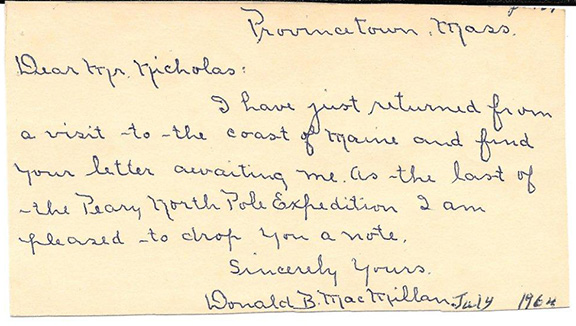 MACMILLAN, Donald B. (1874-1970). American explorer, accompanied Admiral Peary on his successful North Pole Expedition (1908-09). He led expeditions to Arctic lands (1913-1937). Author of “Four Years In The White North” (1918), “Kahda” (1929), “How Peary Reached the North Pole” (1932). Autograph letter signed, 1 page, oblong on card stock. Provincetown, Mass, n.d. (July 1964). Nice content mentioning that he is the last of the Peary North Pole Expedition. Signed in full. Uncommon in autograph letters signed..................$125.00