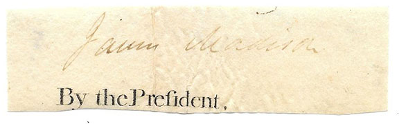 MADISON, James  (1751-1836).  Fourth President of the United States  (1809-1817).  Signature on vellum cut from a document “as President.”   Measures appx. 1”x3.25”. Light wrinkling.....................