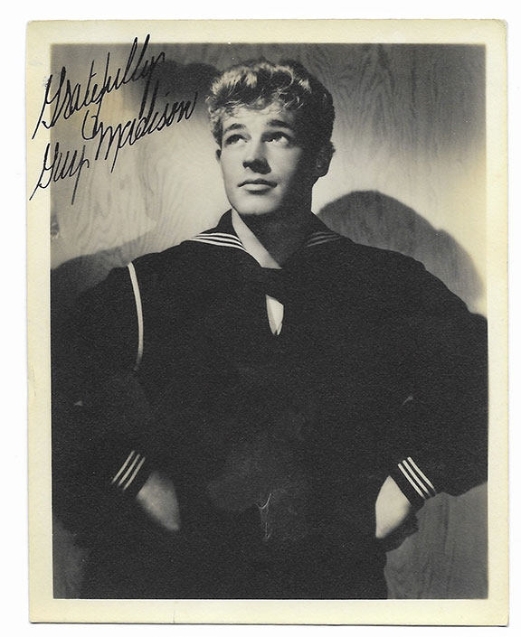 MADISON, Guy (1922-1996). American film. Television and radio personality. Best known for playing “Wild Bill Hickok” in the Western TV series from 1951-1958. Had a star role in “Till the End of Time” (1946) and “The Best Years of Our Lives” (1946). Vintage photograph, 4“x5”, half length pose wearing a U.S. Navy uniform. Hand signed with a sentiment: “Gratefully, Guy Madison.” In fine condition...$60.00![]() |