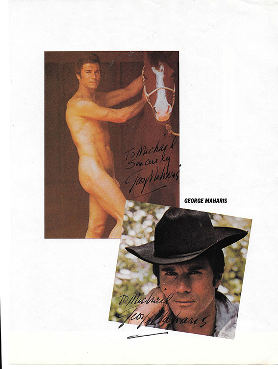 MAHARIS, George (1928- ) Famous Hollywood Actor. Arrested in a gas station bath room and charged with committing a sex act with a male hairdresser (1974). Arrested earlier in 1967 and charged with lewd conduct. He gained TV stardom for his part in “Route 66” (1960-64). He also starred in “The Most Deadly Game” 1970-71) and “Search For Tomorrow” (1960-61). He appeared in 15 movies and his recording career produced 6 albums. He is one of the first celebrities to pose for a nude centerfold (Playgirl, July 1977). Two portraits on a single page each inscribed: “To Michael” and signed in full. The top portrait is of Maharis nude. This was taken from the Playgirl centerfold of July 1977. Signed photographs of George Maharis can be considered quite rare............................$60.00