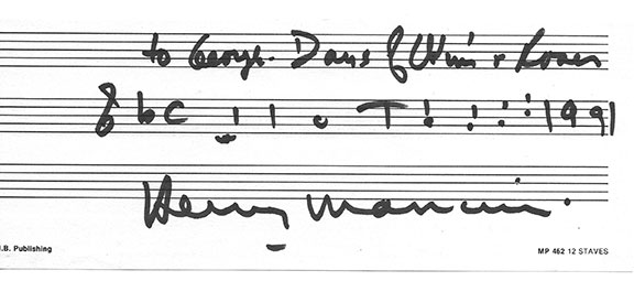 MANCINI, Henry (1924-1994). American composer and conductor with over 13 Academy Award nominations, 20 Grammy Awards, etc. Autograph musical quotation, signed. Three bars of music on music paper identified by the composer as from Days of Wine & Roses. Inscribed to ‘George” and very boldly signed. A choice example from one of his greatest hits..................SOLD