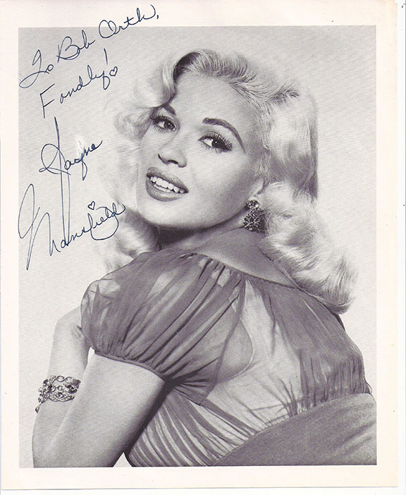 MANSFIELD, Jayne (1933-1967). Popular blonde bombshell actress. Killed at a young age in an automobile accident. Printed portrait, bust pose, full face inscribed and signed: “To Bob Orth, Fondly! Jayne Mansfield”. Slight smear on the top of the “y’ in Jayne. Bob Orth was Curator of Mid-American Film Archive. Mansfield is becoming somewhat uncommon in genuine signed portraits.................... $475.00 |