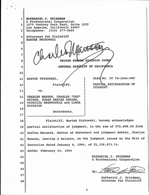 MANSON, Charles (1934-2017). American criminal who led what became known as the Manson family. He is known as the "icon of evil." Charged and convicted of murder and conspiracy. Sentenced to death but that was automatically commuted to life imprisonment by a 1972 court decision eliminating the death penalty in California. He was denied parole 12 times. His net worth at the time of his death was $400,000. Document signed, one full page, February 24, 1994, United States District Court of California. Bartek Frykowski, Plaintiff, vs. Charles Manson, Charles “Tex” Watson, Susan Denise Atkins, Patricia Krenwinkle and Linda Kasabian, Defendants, Plaintiff acknowledges the sum of $72,608.26 from Geffen Records debtor of Charles Manson leaving a balance of $1,338,873.74. Boldly signed by Charles Manson incorporating a Swastika. Manson’s signature is a “10.” Very fine condition...............SOLD